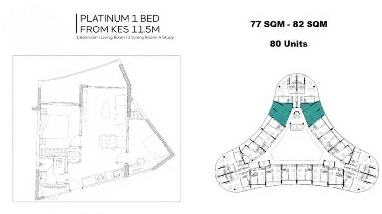 | 1 Bedroom plus Study Platinum | 1 Bedroom | KES 11,500,000 | 1 | 1 | 79 sqm | 2028 |